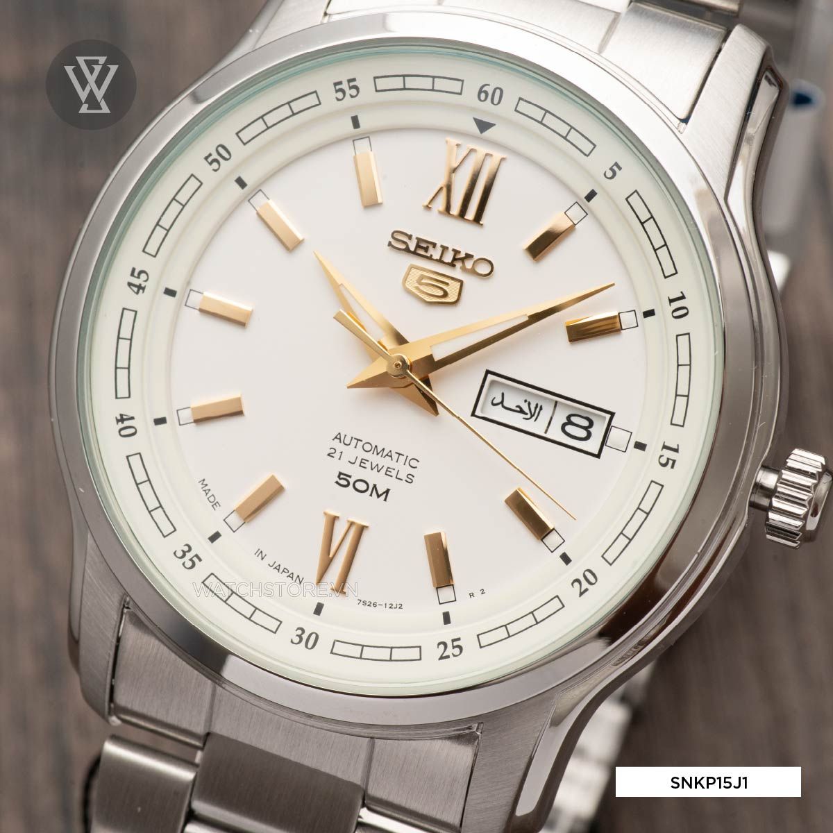 Hướng 3h vẫn được Seiko đặt ô cửa sổ lịch kép ngày và thứ nhỏ gọn để người dùng nắm rõ thời gian. Điểm đặc biệt ở chức năng lịch ngày là bạn có thể điều chỉnh theo 2 ngôn ngữ: tiếng Anh và tiếng Ả Rập bằng cách xoay núm đồng hồ.